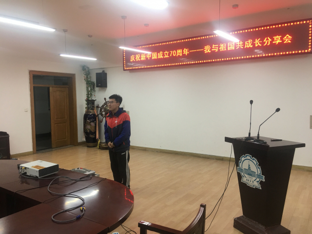 活动主要以多位同学上台分享自己与祖国的故事开始。首先,郑海鹏同学分享了自己在512汶川大地震之中的所见所感,地震过后汶川的大地上满目疮痍,灾区同胞们笼罩在失去亲人和家园的悲痛中,唯有祖国和人民迅速做出救援行动,祖国向灾区投入几十万人的救援队伍,每一位国人无私为灾区捐赠物资,在短短的几年里重建起往日的家园。这一切行动深深的感受到祖国这一坚强后盾和人民的团结。如今作为新时代的青年要“懂感恩,知回报”,将自己的未来同祖国的命运相结合,为中华民族伟大复兴而不断奋斗。接下来,杨鹏骋等同学也主动上台分享自己与祖国的故事,作为新时代的青年,应与祖国同命运、共呼吸,祖国的新时代是青年们奋斗出来的。